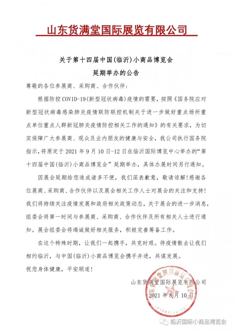 Announcement on the postponement of the 14th China (Linyi) small commodity Expo