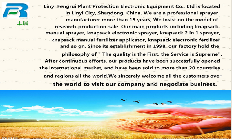 Linyi Fengrui Plant Protection Electronic Equipment Co., Ltd is located in Linyi City, Shandong, China. We are a professional sprayer manufacturer more than 15 years, We insist on the model of research-production-sale. Our main products including knapsack manual sprayer, knapsack electronic sprayer, knapsack 2 in 1 sprayer, knapsack manual fertilizer applicator, knapsack electronic fertilizer and so on. Since its establishment in 1998, our factory hold the philosophy of " The quality is the First, the Service is Supreme". After continuous efforts, our products have been successfully opened the international market, and have been sold to more than 20 countries and regions all the world.We sincerely welcome all the customers over the world to visit our company and negotiate business.