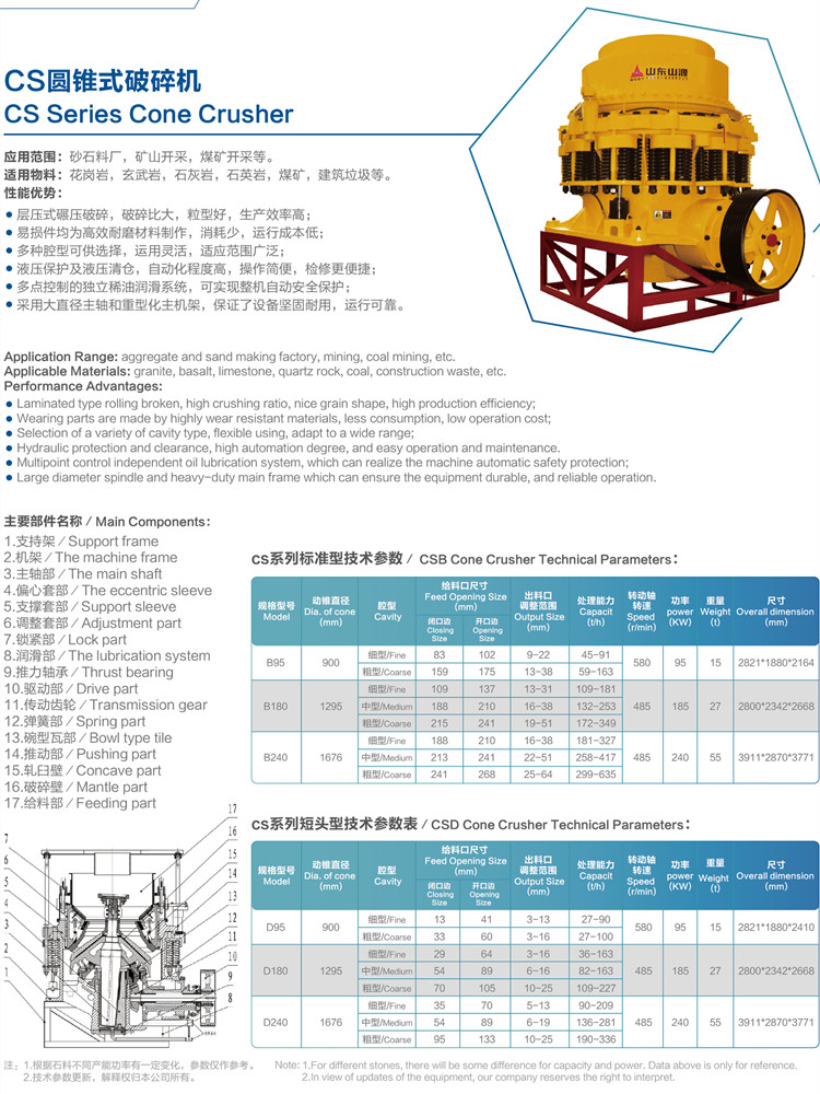 CS series cone crusher is applied to cement mill, mining, building construction, road &bridge construction, railway construction and metallurgy and some other industries. Materials like iron ore, granite, limestone, quartzite, sandstone, cobblestone and some others are easily crushed by cone crusher.