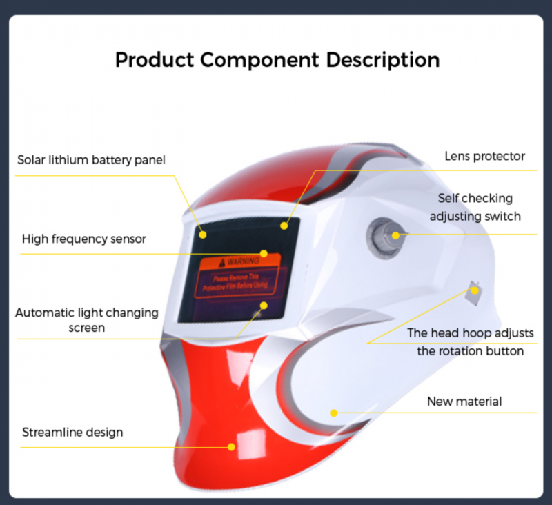 Rotate button to adjust sensitivity and dimming speed Automatic sensor Automatic arc induction adjustment 1. Solar panels 2. High-sensitivity detector 3. Automatic dimming screen Clear vision The product adopts an integrated light-changing water screen, high-definition field of vision, welding is more convenient and simple, so you can use it at ease Double filter Double filter to avoid harmful ultraviolet and infrared radiation generated by arc, and damage to eyes caused by strong welding light! |