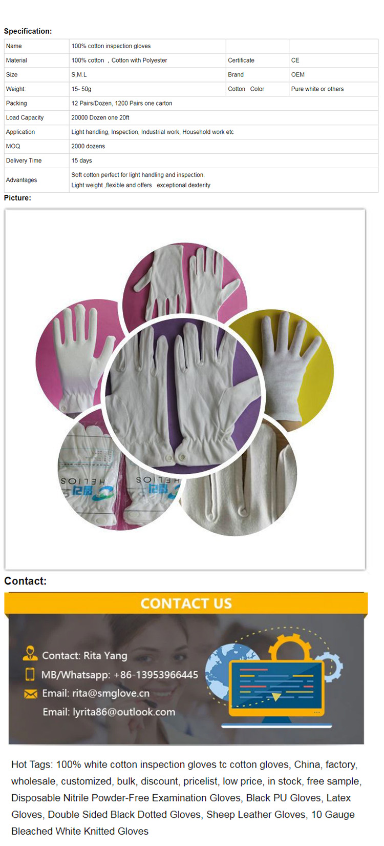 It usually used as inspection gloves,cotton etiquette gloves, waiter gloves, police gloves etc.
