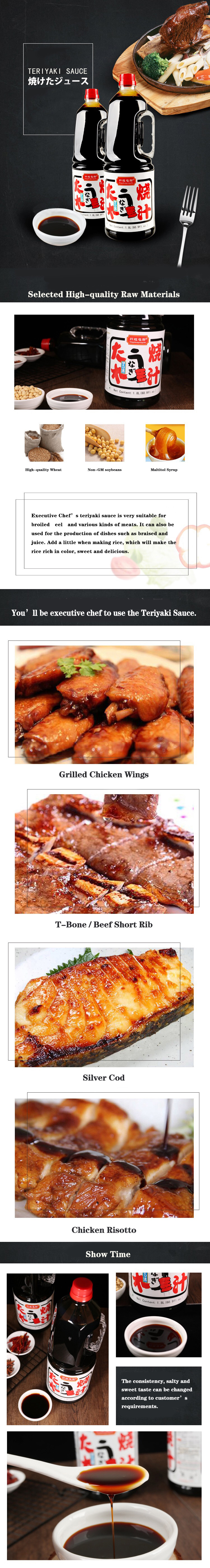 Executive Chef’s teriyaki sauce is very suitable for broiled eel and various kinds of meats. It can also be used for the production of dishes such as braised and juice. Add a little when making rice, which will make the rice rich in color, sweet and delicious.