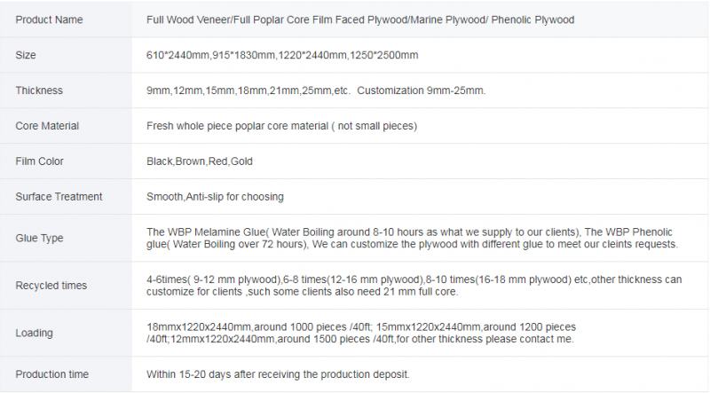 A: Our full poplar core film face plywood is specially designed for the construction formwork or the concrete shutter, the board is totally waterproof with the waterproof glue !  You may take a sample to put it into water for a few days to test it by yourself.