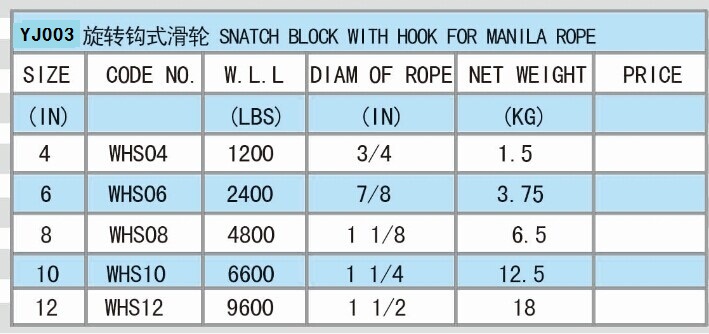» YJ003 SNATCH BLOCK WITH HOOK FOR MANILA ROPE