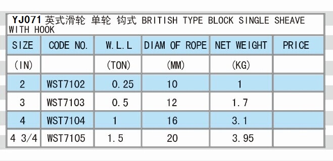 » YJ071 BRITISH TYPE BLOCK SINGLE SHEAVE WITH HOOK