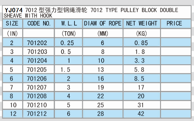 YJ074 7012 TYPE PULLEY BLOCK DOUBLE SHEAVE WITH HOOK