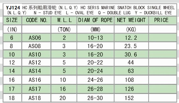 YJ124 HC SERIES MARINE SNATCH BLOCK SINGLE WHEEL