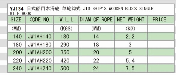 » YJ134 JIS SHIP'S WOODEN BLOCK SINGLE WITH HOOK