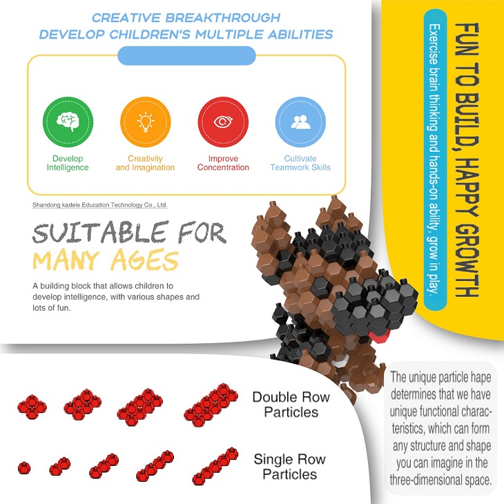KADELE blocks are integrated into the STEM (science, technology, engineering, art and mathematics) educational knowledge system, and are also kids learning toys, which can cultivate kids logical thinking ability, hand-eye coordination ability, imagination and creativity.