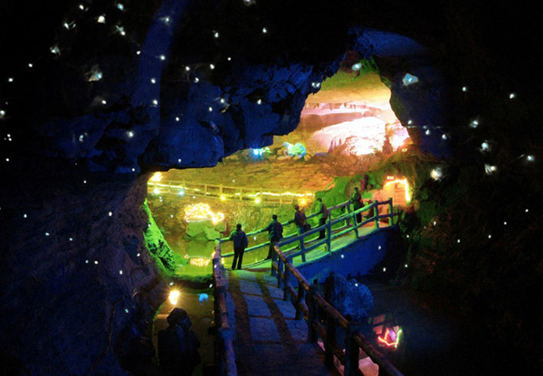 The Yishui Underground Firefly Water Cave under the Shimishan Mountain is 19 kilometers south of the Yishui county town. It is a well-known mysterious world of fireflies underground. The cave, shaped between 65,000,000 and 230,000,000 years ago, is 1,200 meters long. Apart from plentiful stalactites and other variously-posed stones, there exist fireflies which exclusively live in the dark and wet caves. Walking along the cave and watching the flashing lights, one can’t help assuming he is stepping into a fairyland. As the only cave of its kind in Asia, the Underground Firefly Water Cave is the only one to rival the Fireflies Waitomo Cave in Auckland, New Zealand.